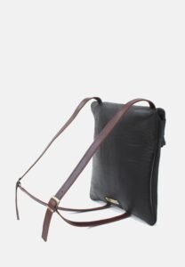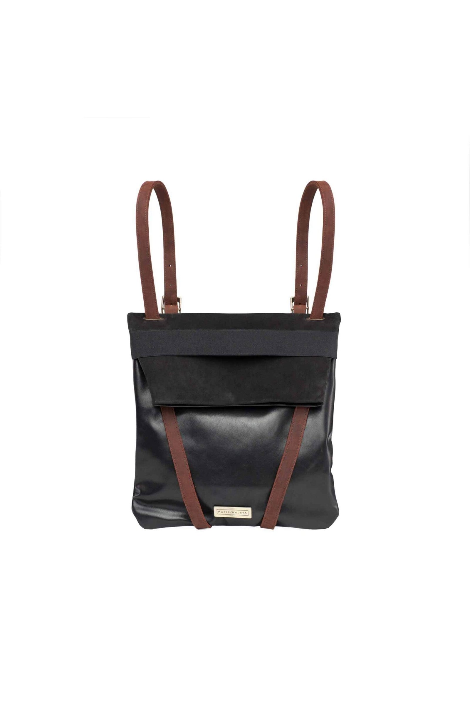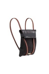 Backpack laptop bag in black leather. Black leather in one side. Back in black nubuck. Upcycled black elastic from the waste of polyester and cotton. and adjustable straps 70cm – 80cm. Two inner pockets. Dimensions: 35×33 cm. With an extra handle strap. REF. MMBPB Made in Portugal